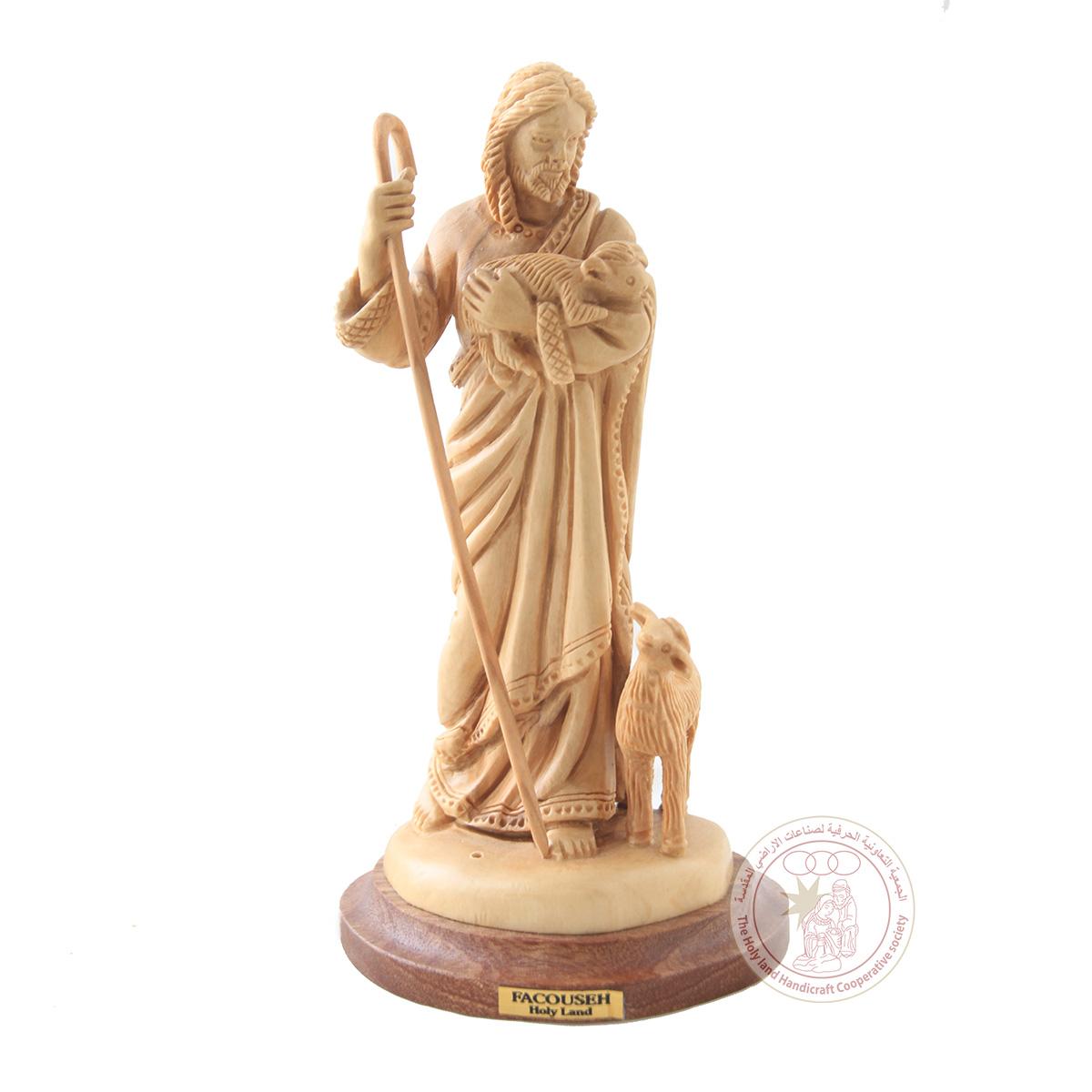 This carved statue depicts Christ as the Good Shepherd from the parable recalled in the Gospel of John. It was carved in Bethlehem from Holy Land olive wood.