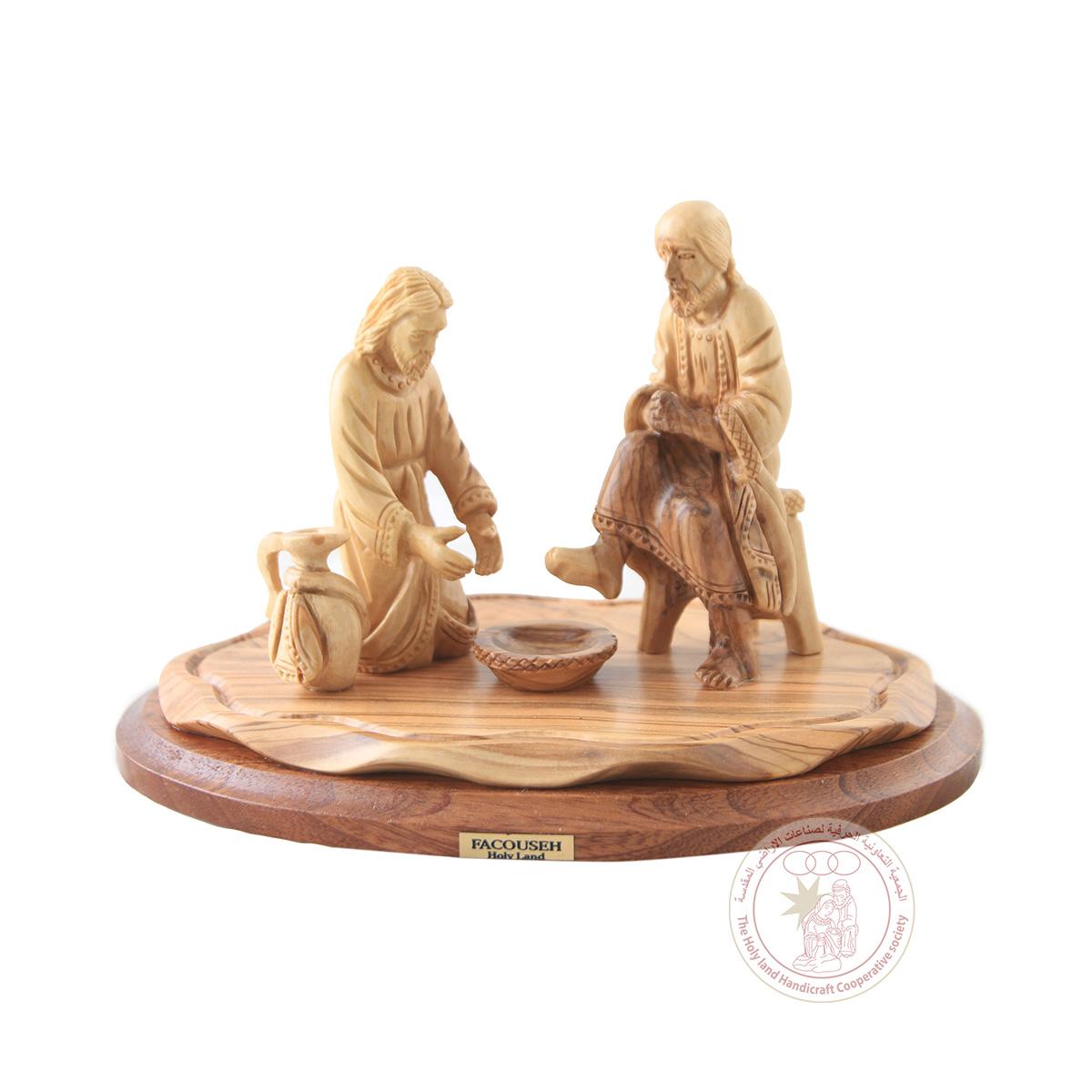This figurine is of Christ washing the feet of an apostle during the Last Supper, as recalled in the Gospel of John. It was carved in Bethlehem from Holy Land olive wood.
