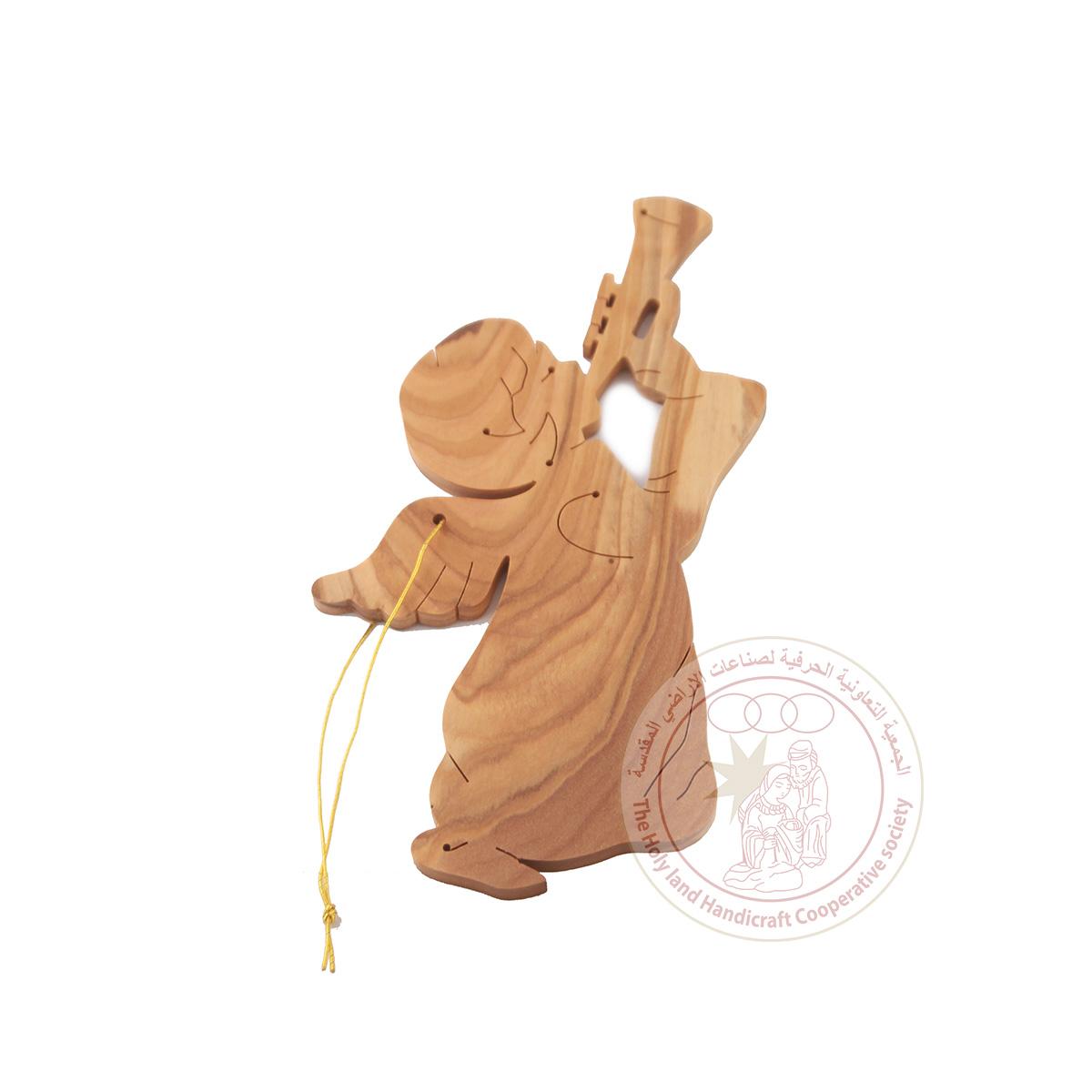 Olive Wood Angel lifting his head, playing with flute