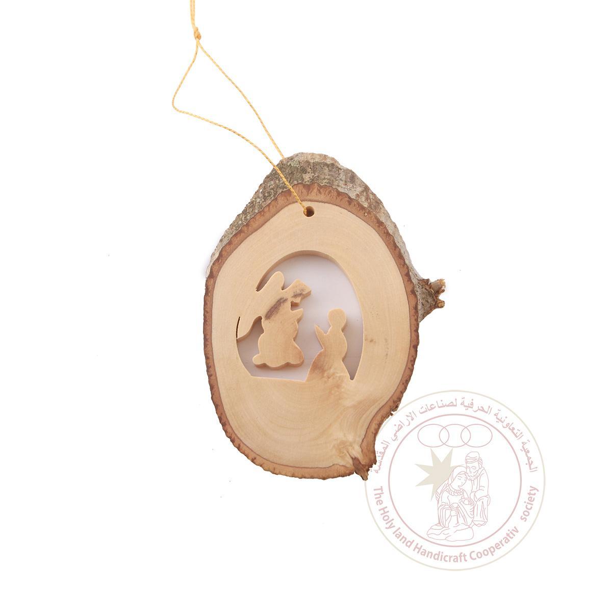Olive Wood oval Ornament, with natural wood bark, praying angel