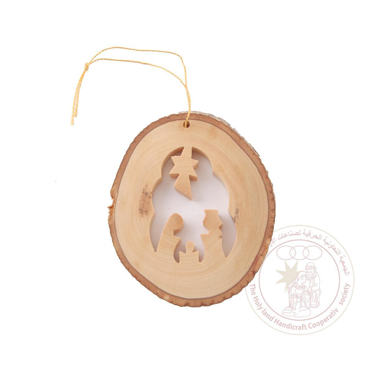 Olive Wood oval Ornament, with natural wood bark, holy family