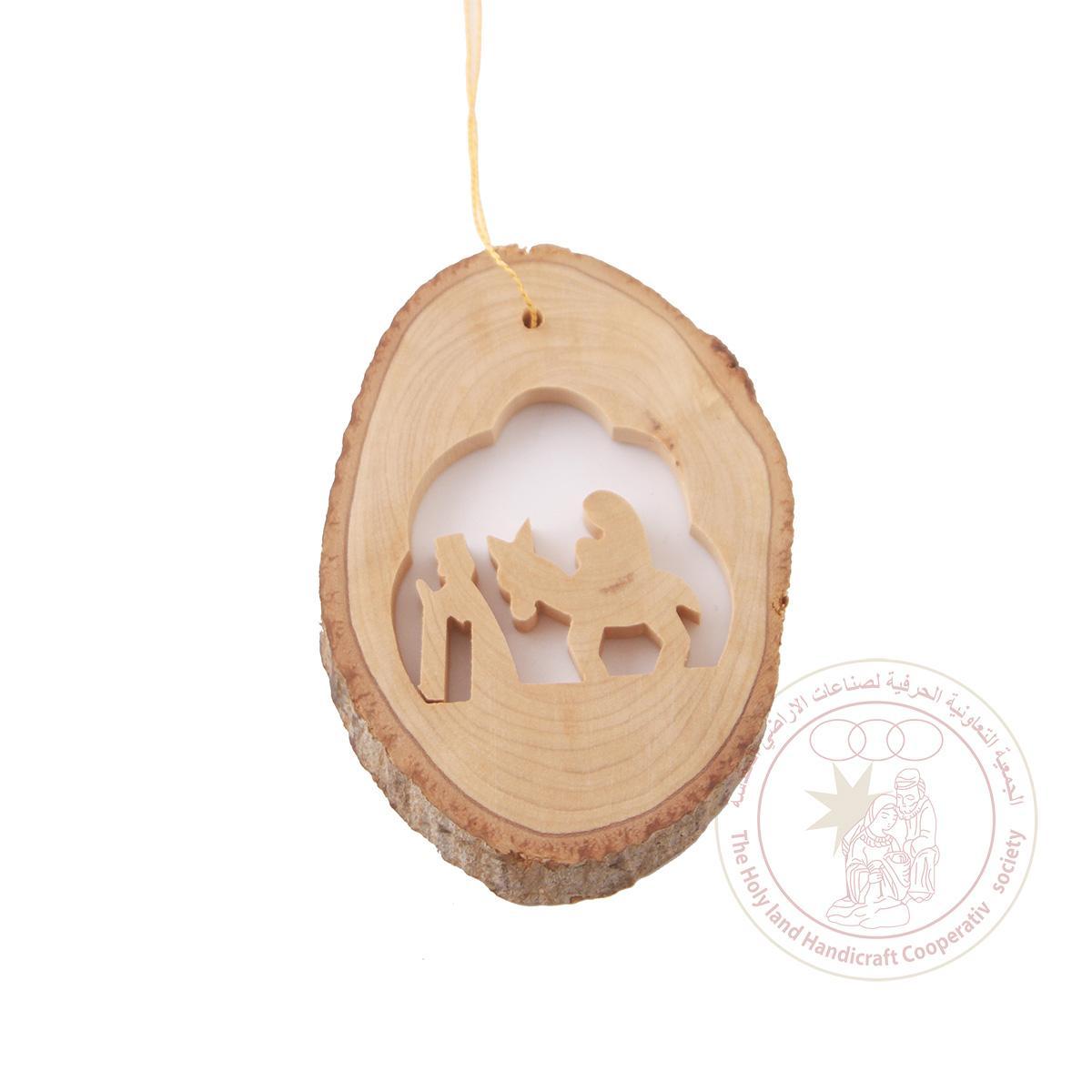 Olive Wood oval Ornament, with natural wood bark, Flight To Egypt