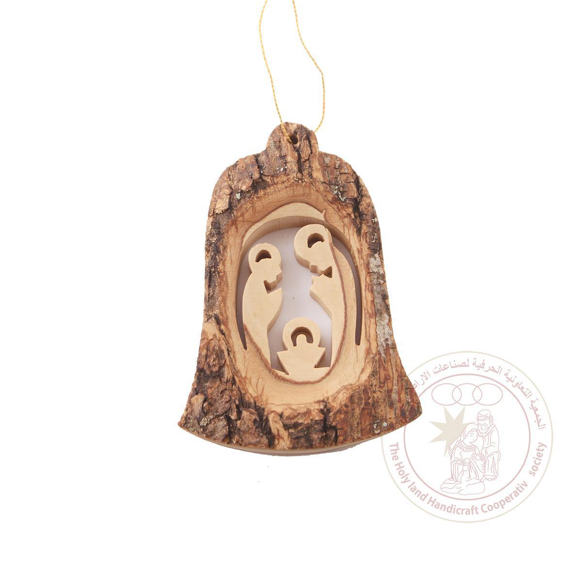 Olive Wood bell Ornament, with natural wood bark, Holy Family
