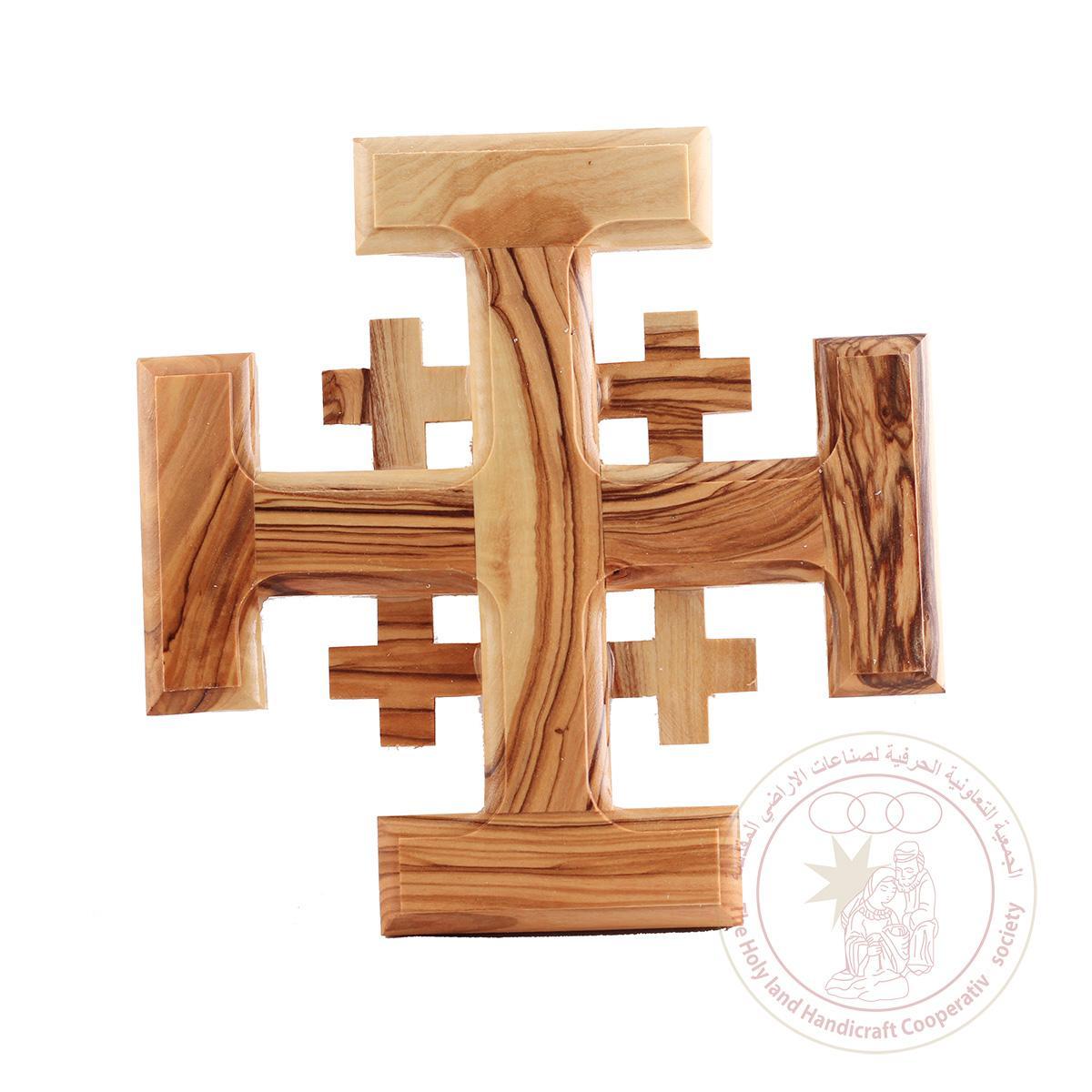 This is a Jerusalem cross, suitable for hanging on a wall. It is made of olive wood by artisans from Bethlehem. Romans 5:8 ''But God shows his love for us in that while we were still sinners, Christ died for us''.