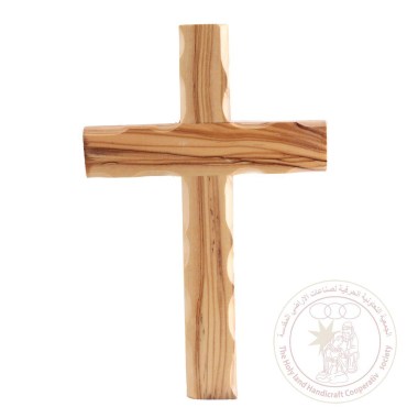 This is a plain cross, suitable for hanging on a wall. It is made of olive wood by artisans from Bethlehem.