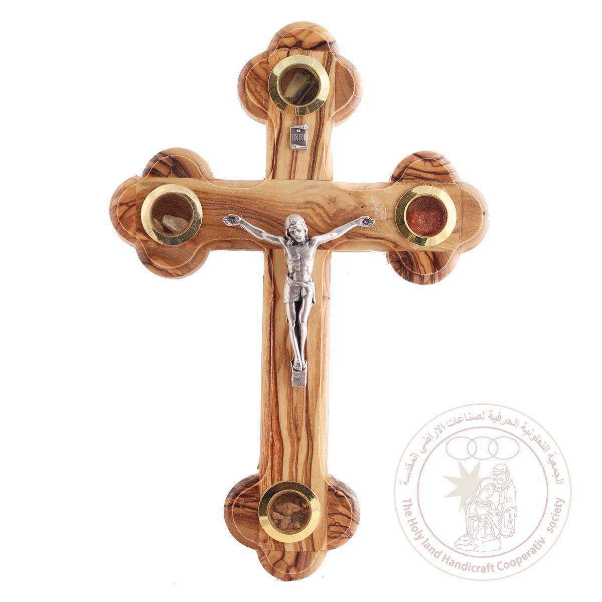 This is an Orthodox crucifix with four inlaid pieces of earth, leaves and incense from the Holy Land, suitable for hanging on a wall. The cross is made of olive wood by artisans from Bethlehem.