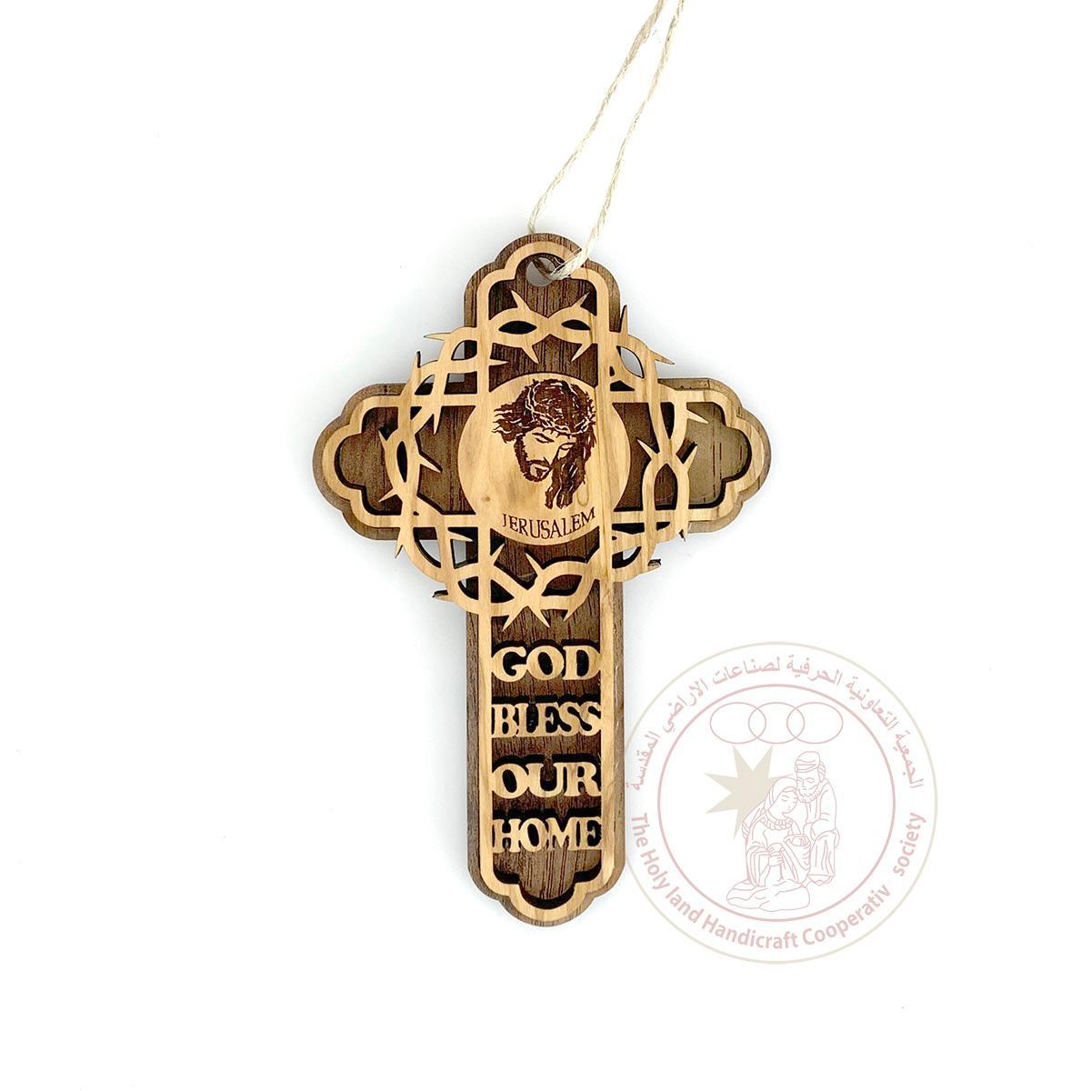 This olive wood cross with laser-cut decoration features the inscription ''God Bless Our Home'', the face of Christ and the Crown of Thorns. Made by Bethlehem artisans.