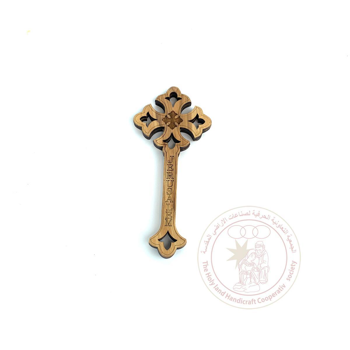 This olive wood blessing cross is used by priests during services. It has 'Jerusalem' inscribed on it and is decorated using laser-cut technology. Made by Bethlehem artisans.