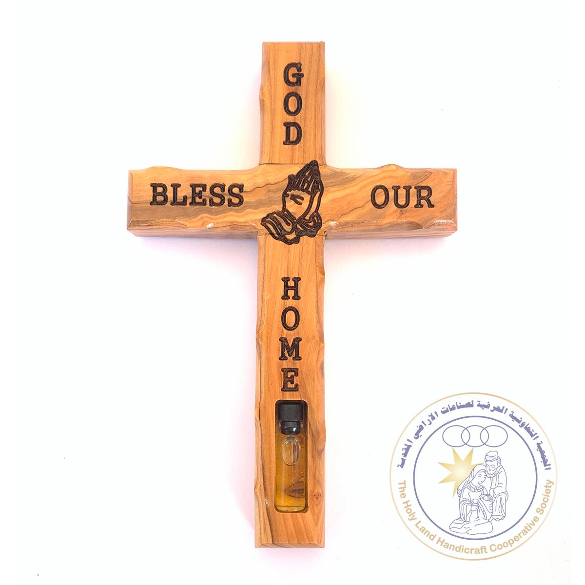 Olive Wood/ God bless our home, 1 bottle of olive Oil, Jerusalem at the back face of the cross, Wall Hanging