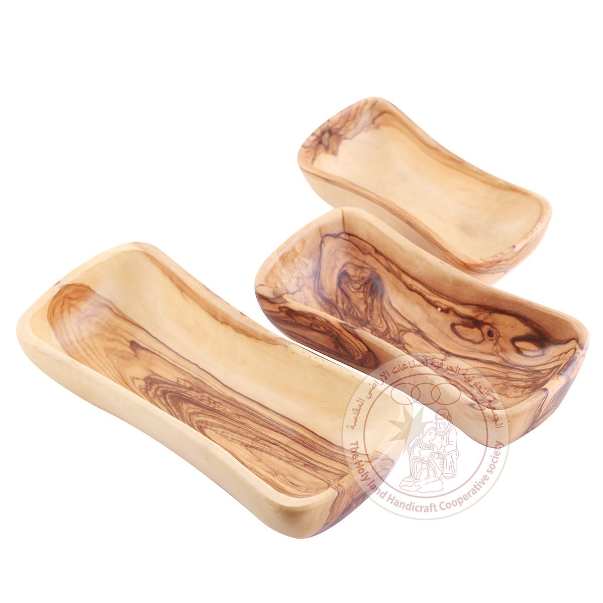 This four-piece rectangular serving bowl set features a curved design. The set is made of olive wood, and was made by Bethlehem artisans.