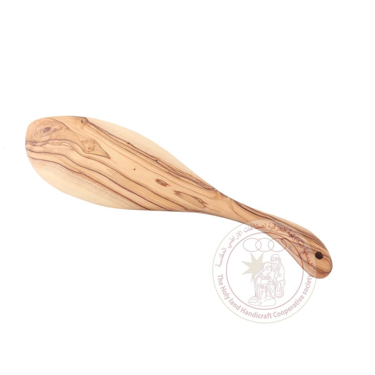 This curved hand spatula is made of olive wood by Bethlehem artisans.