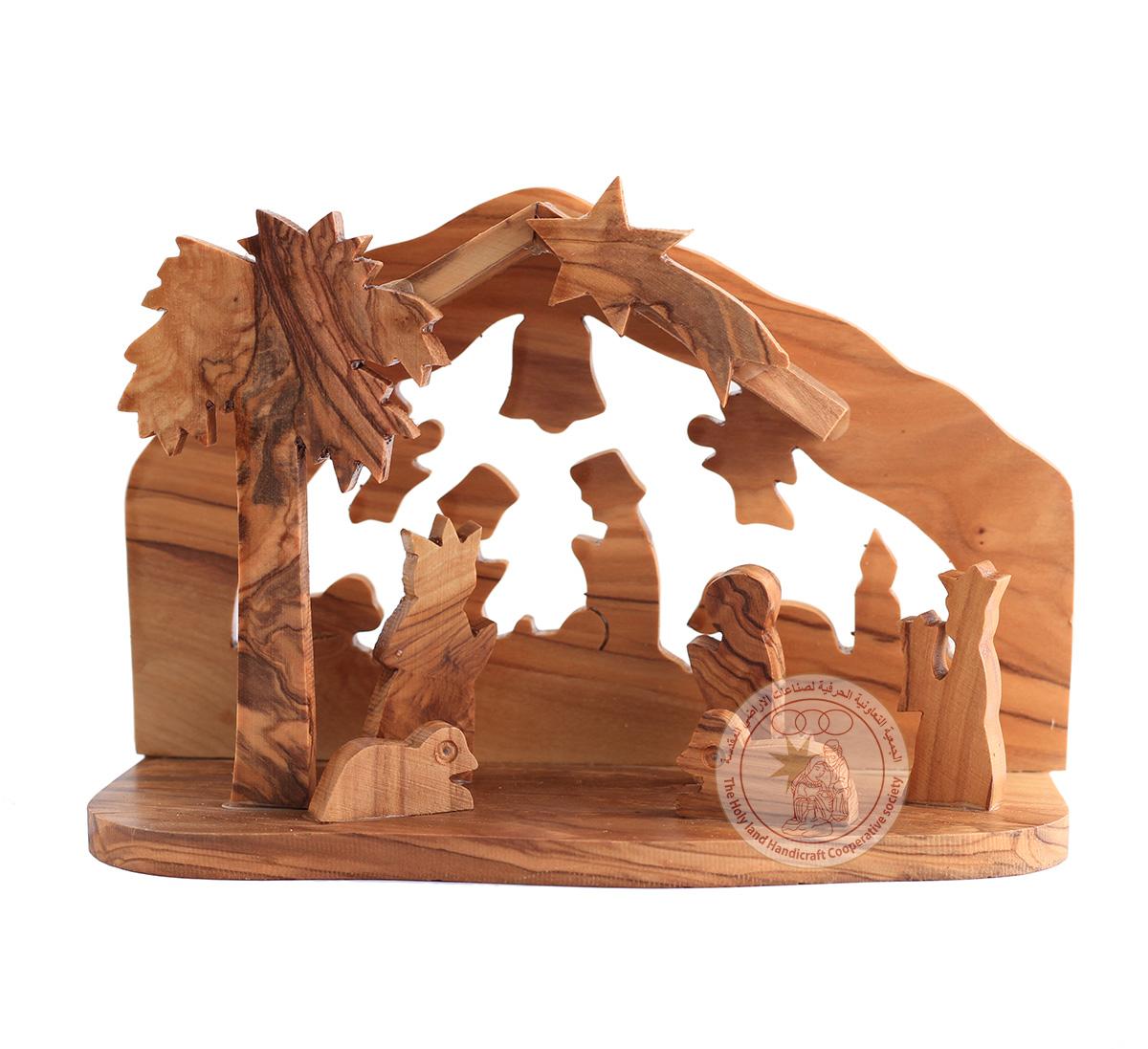 This Nativity creche depicts the Holy Family in humble, simplistic silhouette-style. It is made in Bethlehem with Holy Land olive wood.