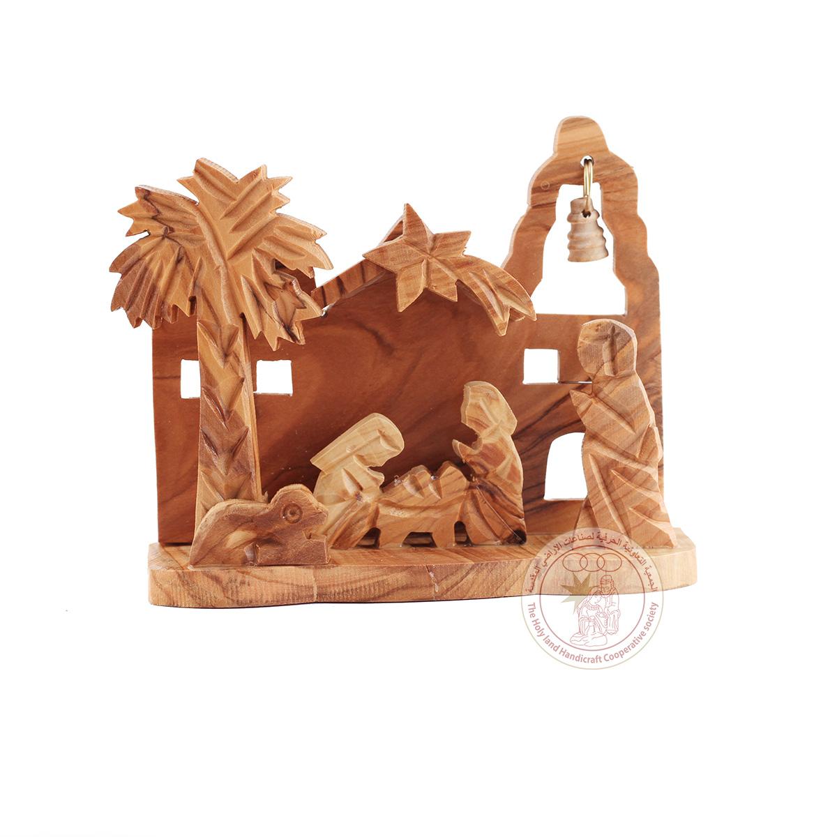 This Nativity creche depicts the Holy Family against the backdrop of the Church of the Nativity in Bethlehem , with a small bell tied to a string for a backdrop. It is made in Bethlehem with Holy Land olive wood.