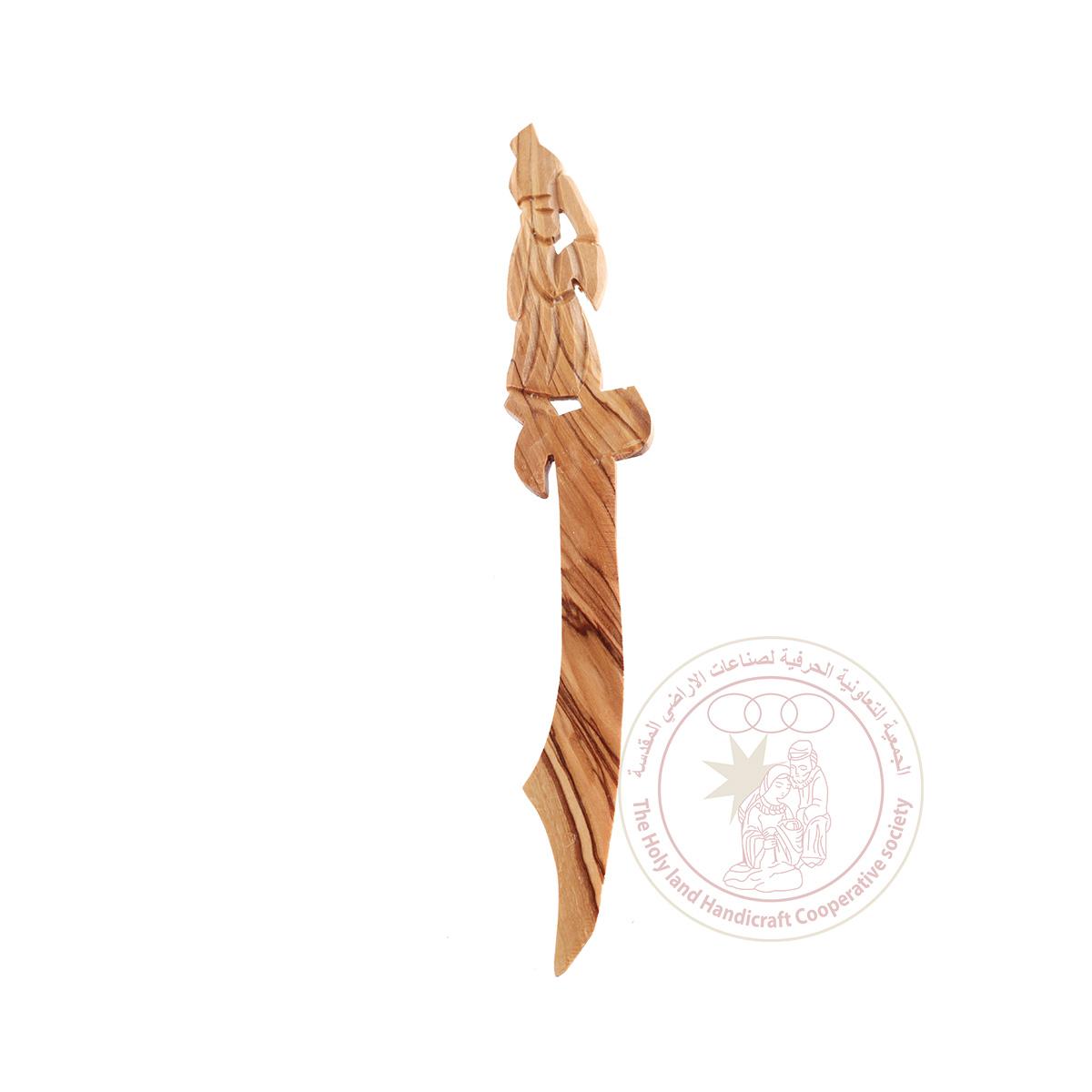 This letter opener features a handle with the shape of a Samaritan Woman as Jesus encountered at the well as recalled in the Gospel of John, and is made of olive wood. It was made by artisans from Bethlehem.