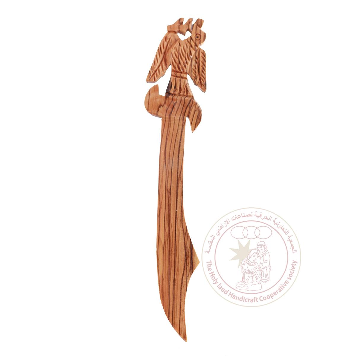 This letter opener features a handle with the shape of a dove, and is made of olive wood. It was made by artisans from Bethlehem.