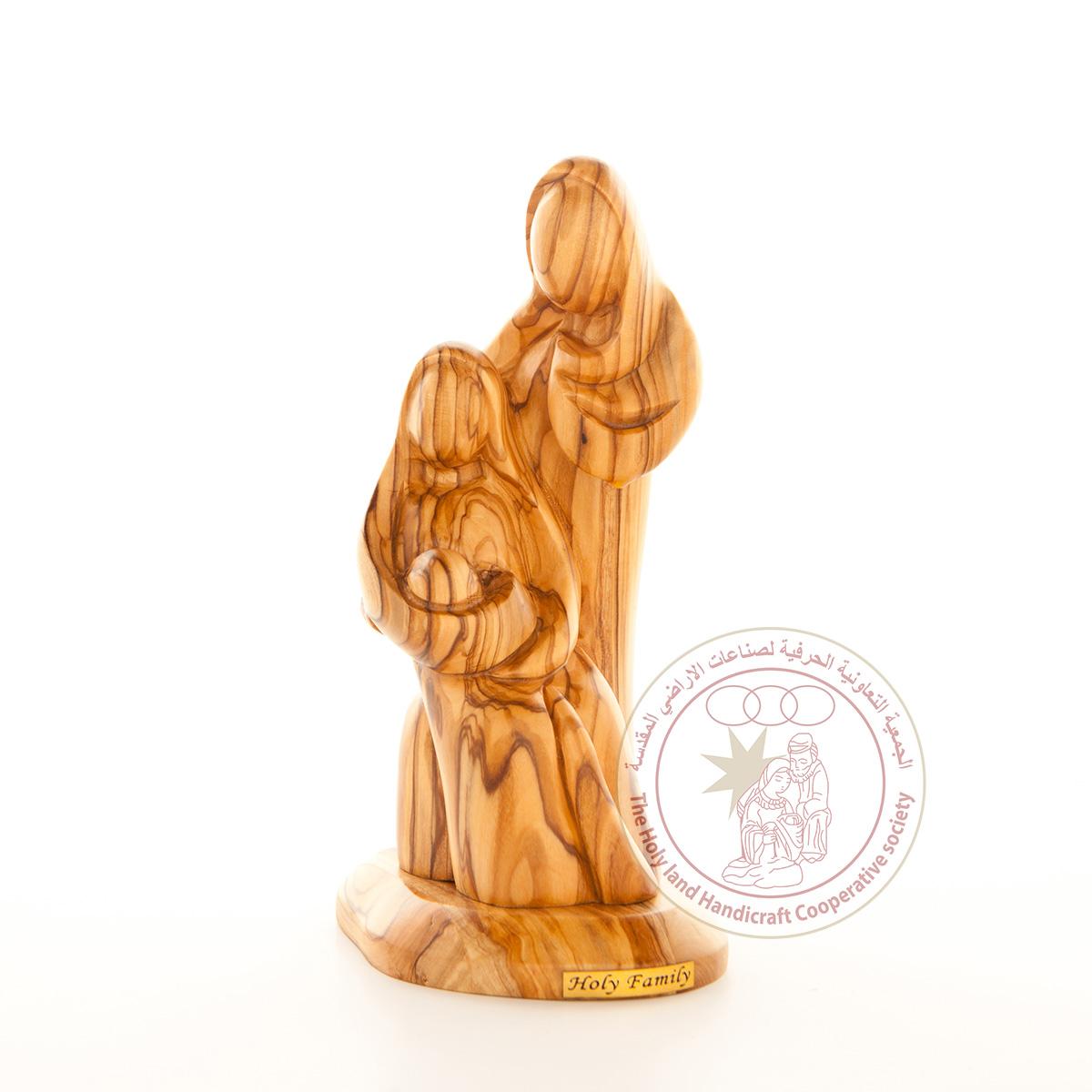 This figurine is of the Holy Family, with the Virgin Mary kneeling with the infant Jesus. It has smooth, faceless features. It was carved in Bethlehem from Holy Land olive wood.