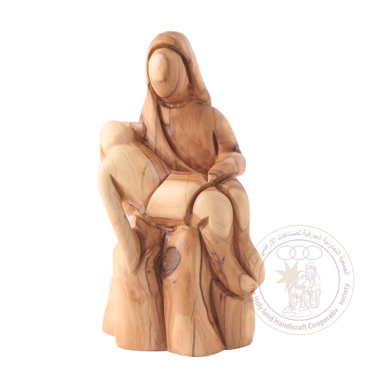 This figurine depicts the Virgin Mary holding Jesus after his crucifixion, a moment known as the Pieta, a pose made famous by the sculptor Michelangelo. It has smooth, faceless features. It was carved in Bethlehem from Holy Land olive wood.