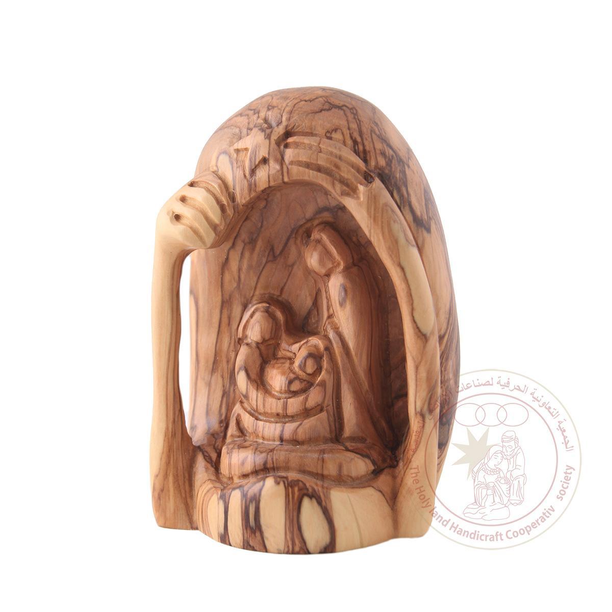 This statuette depicts the Holy Family in the Grotto, with the Star of Bethlehem overhead. It has smooth, plainless features and was made from olive wood by Bethlehem artisans.
