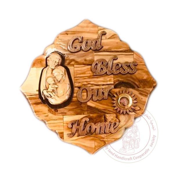 This is an olive wood plaque inscribed with 'God Bless Our Home', a gypsum relief image of the Holy Family, and inlaid incense. Made by Bethlehem artisans.