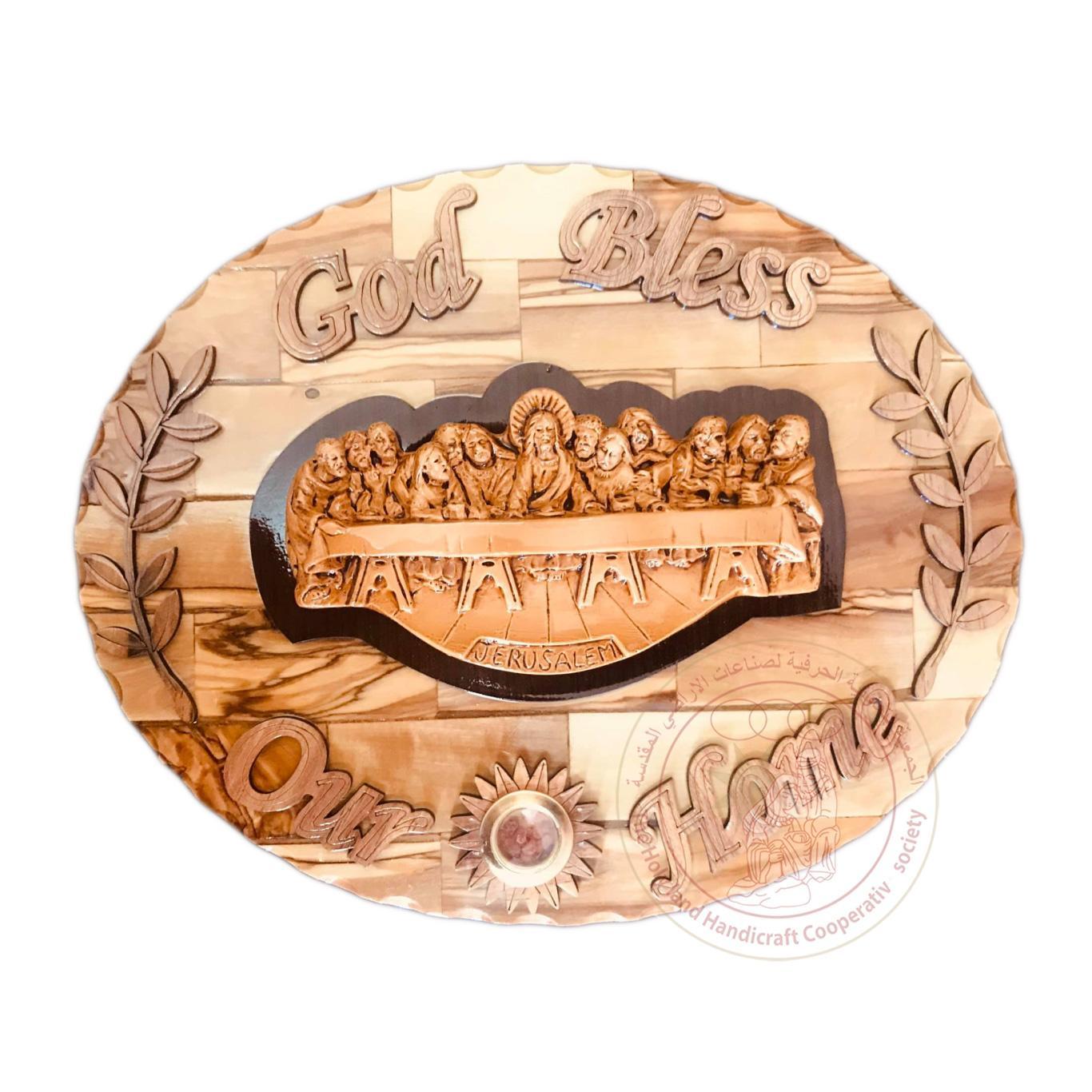 This is an olive wood plaque inscribed with 'God Bless Our Home', a gypsum relief image of the Last Supper, and inlaid incense. Made by Bethlehem artisans.