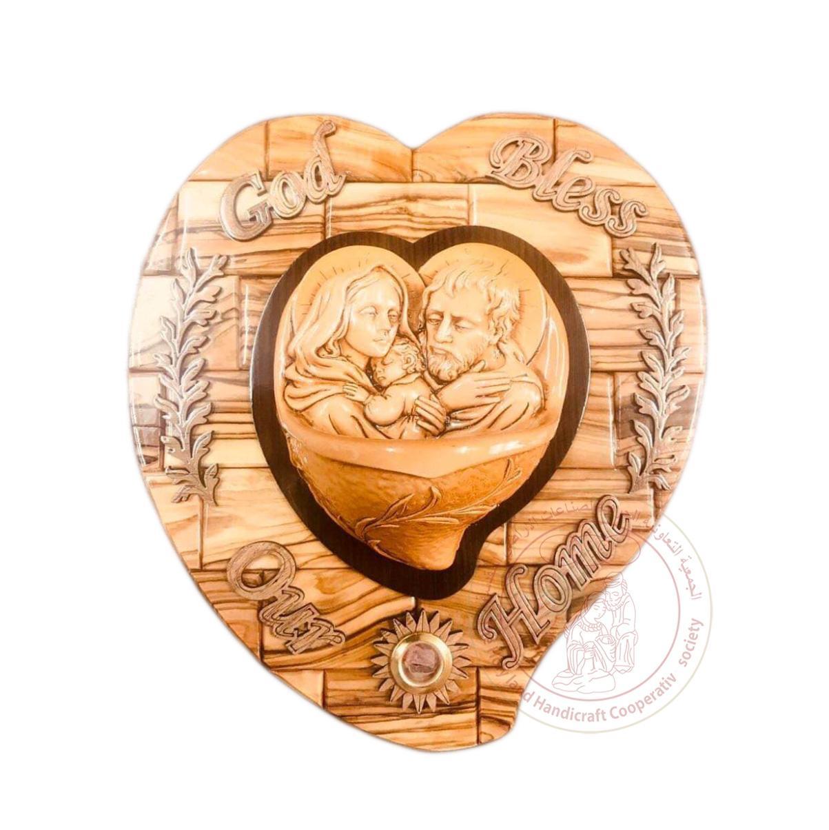 This is an olive wood heart-shaped plaque inscribed with 'God Bless Our Home', a gypsum relief image of the Holy Family, and inlaid incense. Made by Bethlehem artisans.
