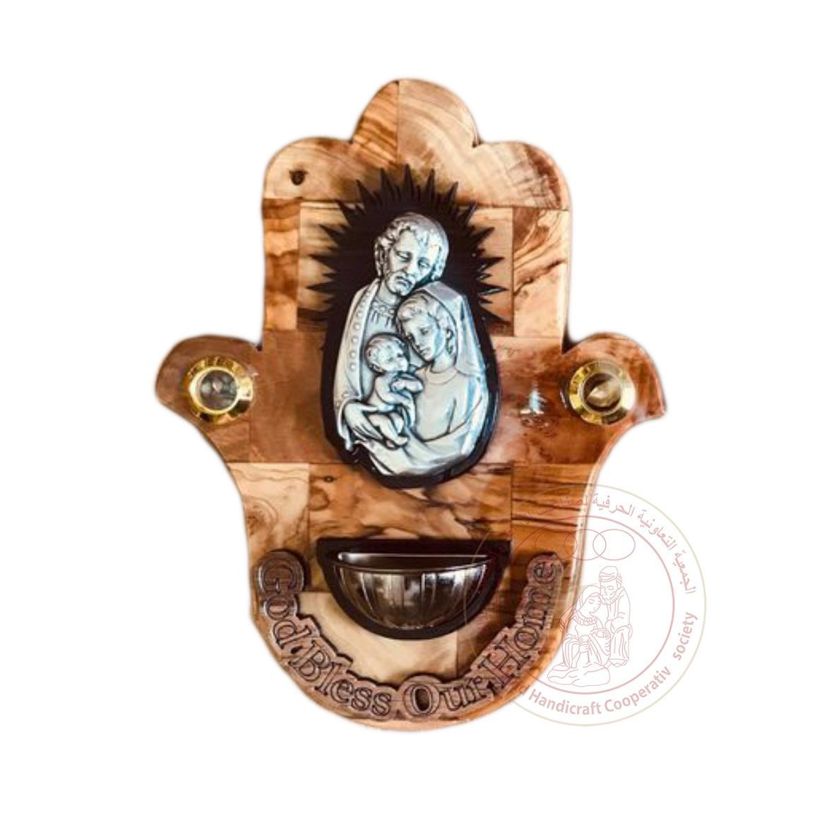 This is an olive wood hamsa-shaped plaque inscribed with 'God Bless Our Home', a gypsum relief image of the Holy Family, and two inlaid incense. Made by Bethlehem artisans.