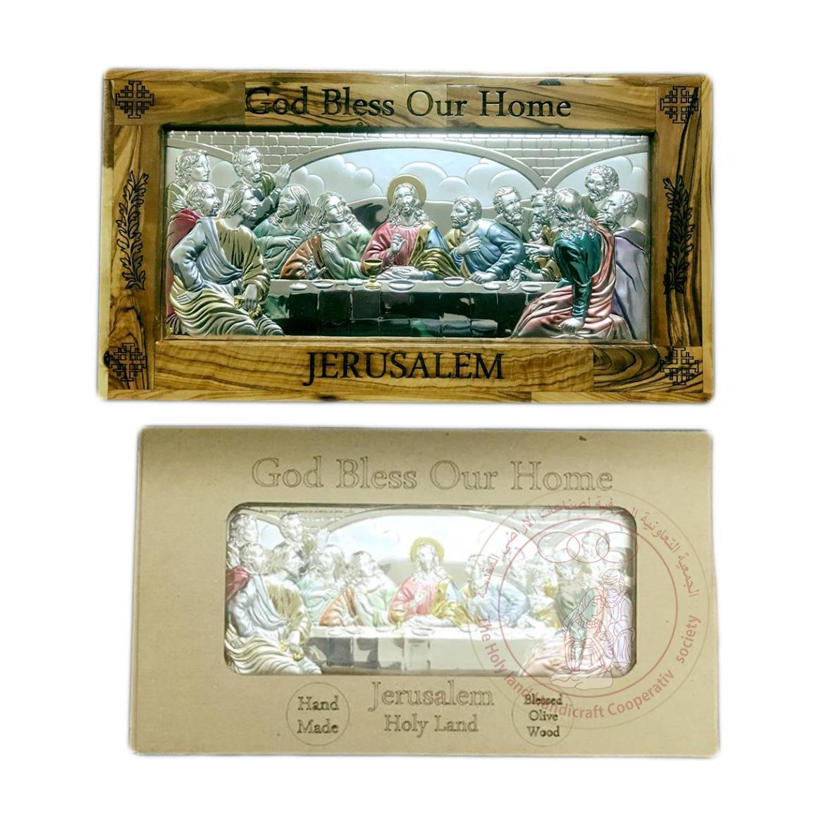 This is a silver-plated relief of the Last Supper, with colored and gold-plated sections. It has an olive wood frame made by Bethlehem artisans inscribed with ''God Bless Our Home'' and 'Jerusalem'.