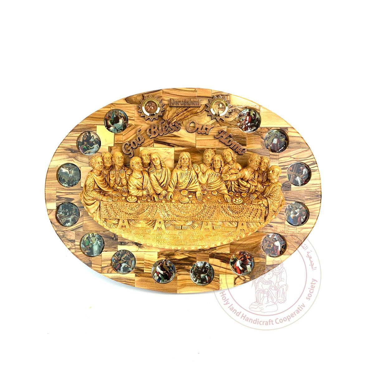 This is an oval-shaped olive wood plaque with the inscription 'God Bless Our Home', a gypsum relief depicting the Last Supper and two inlaid incense. Made by Bethlehem artisans.