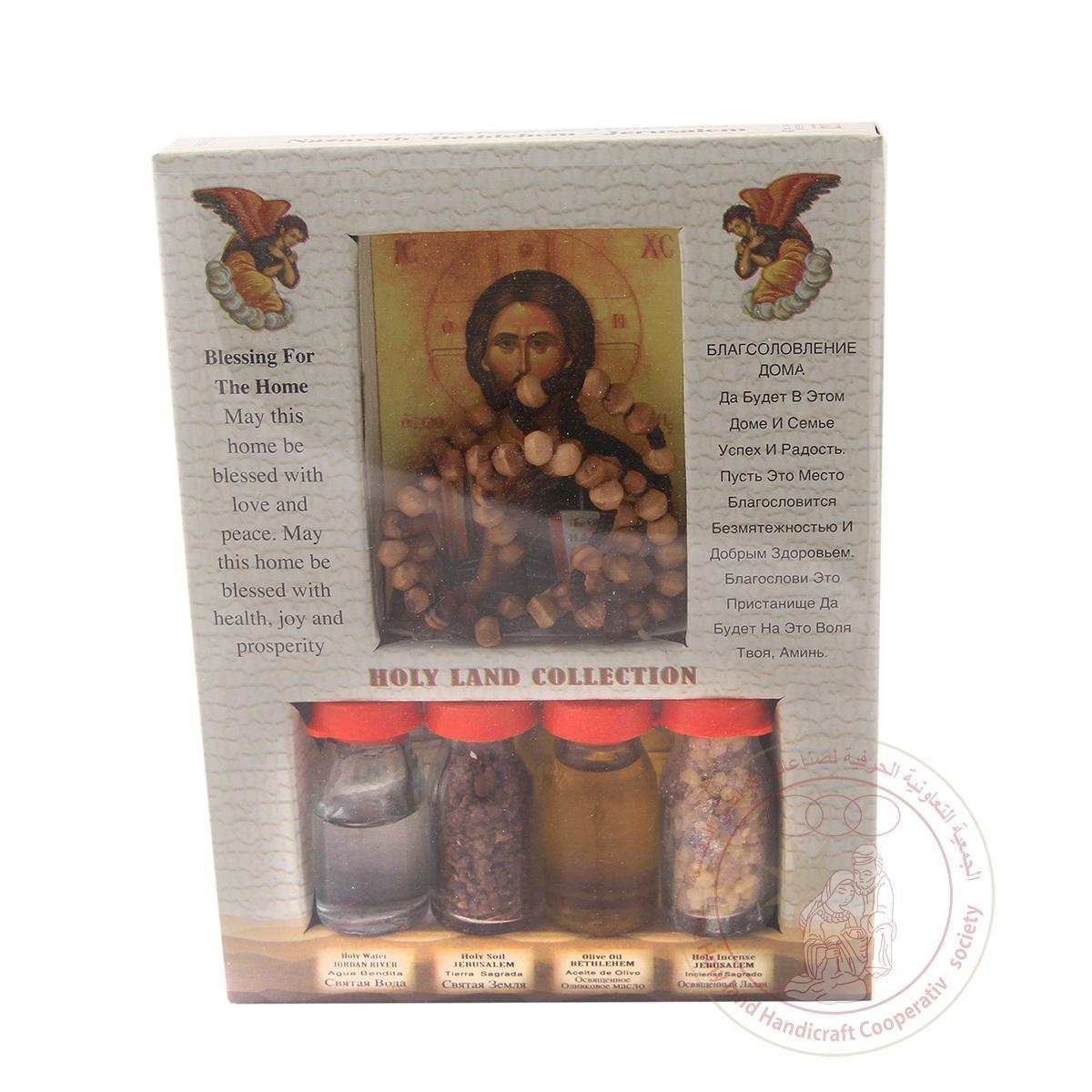 Set of four bottles - Holy Water, Oil, Earth and Incense and rosary