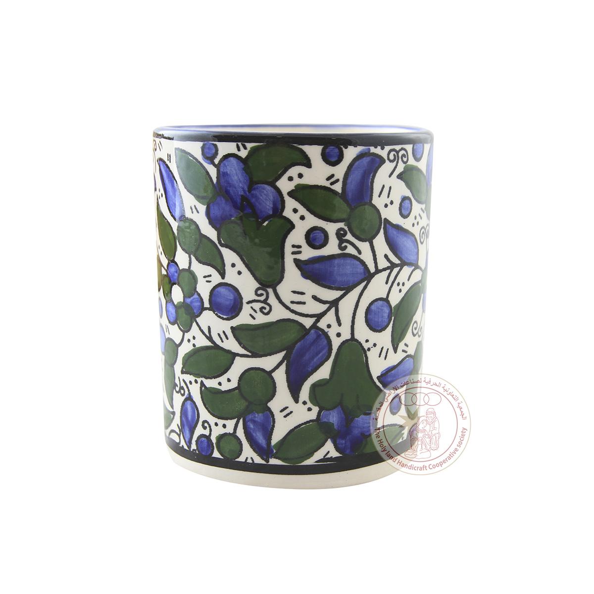 This 10 CM mug is adorned with a blue and green tulips motif. It is our first of three versions in this series. It was made by ceramic artisans from Hebron.