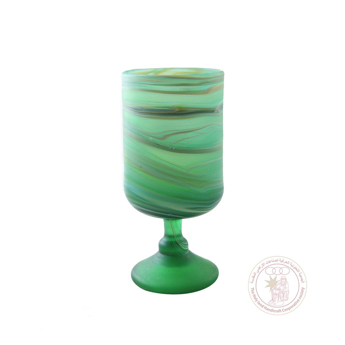 This 16 CM wine glass is made of swirled-style lime green Phoenician glass, and is designed with a short neck and a wrap. It was made by artisans from Hebron.