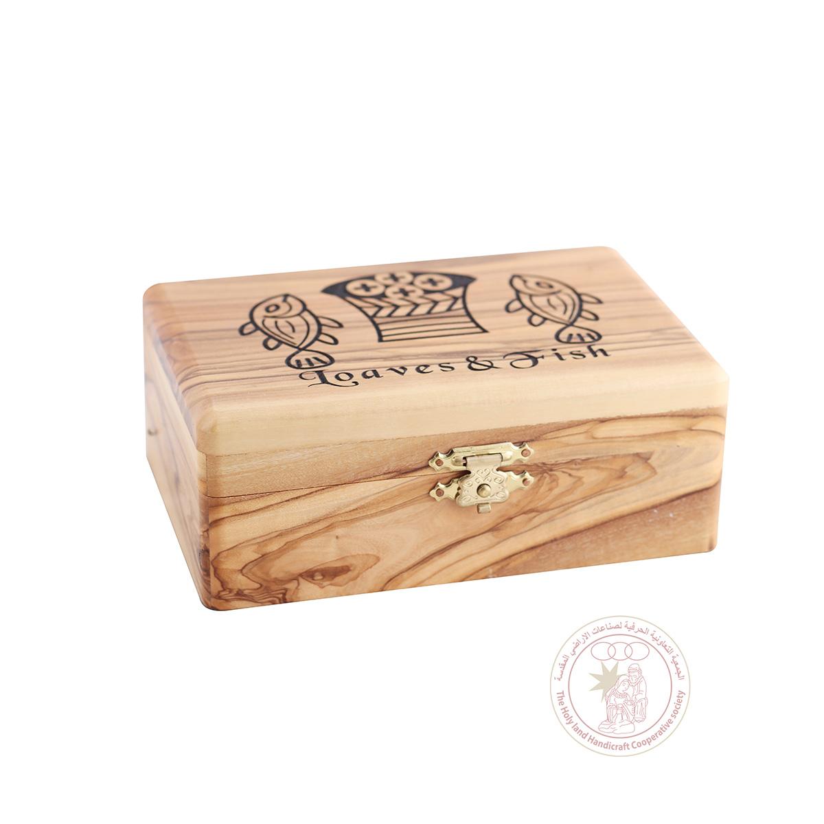 This jewelry box is adorned with a depiction of the famous ancient mosaic of the miracle of the multiplication of the Loaves and Fishes at Tabgha on the Galilee, made in Bethlehem from Holy Land olive wood.