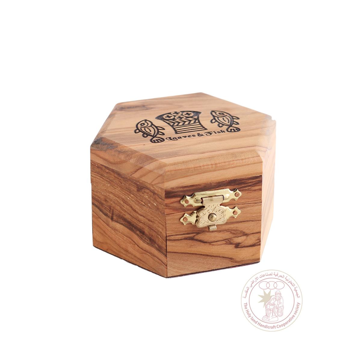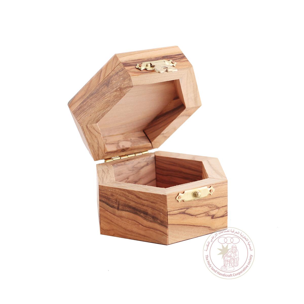 This hexagonal olive wood box was made in Bethlehem from Holy Land olive wood.