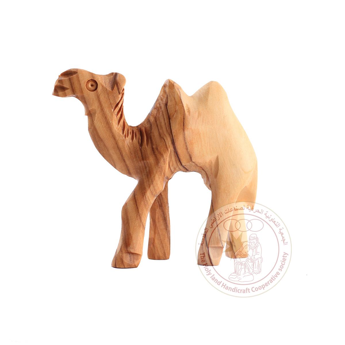 This detailed camel figurine is made of olive wood by Bethlehem artisans.