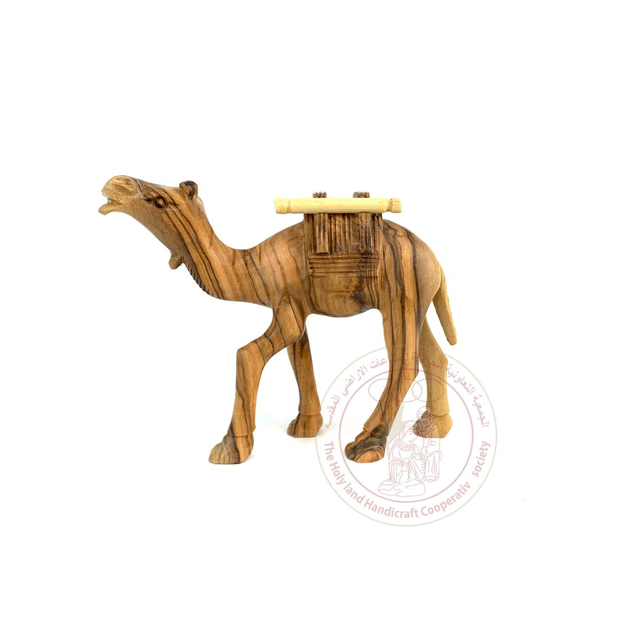 This olive wood camel figurine has detailed features and was made by Bethlehem artisans.