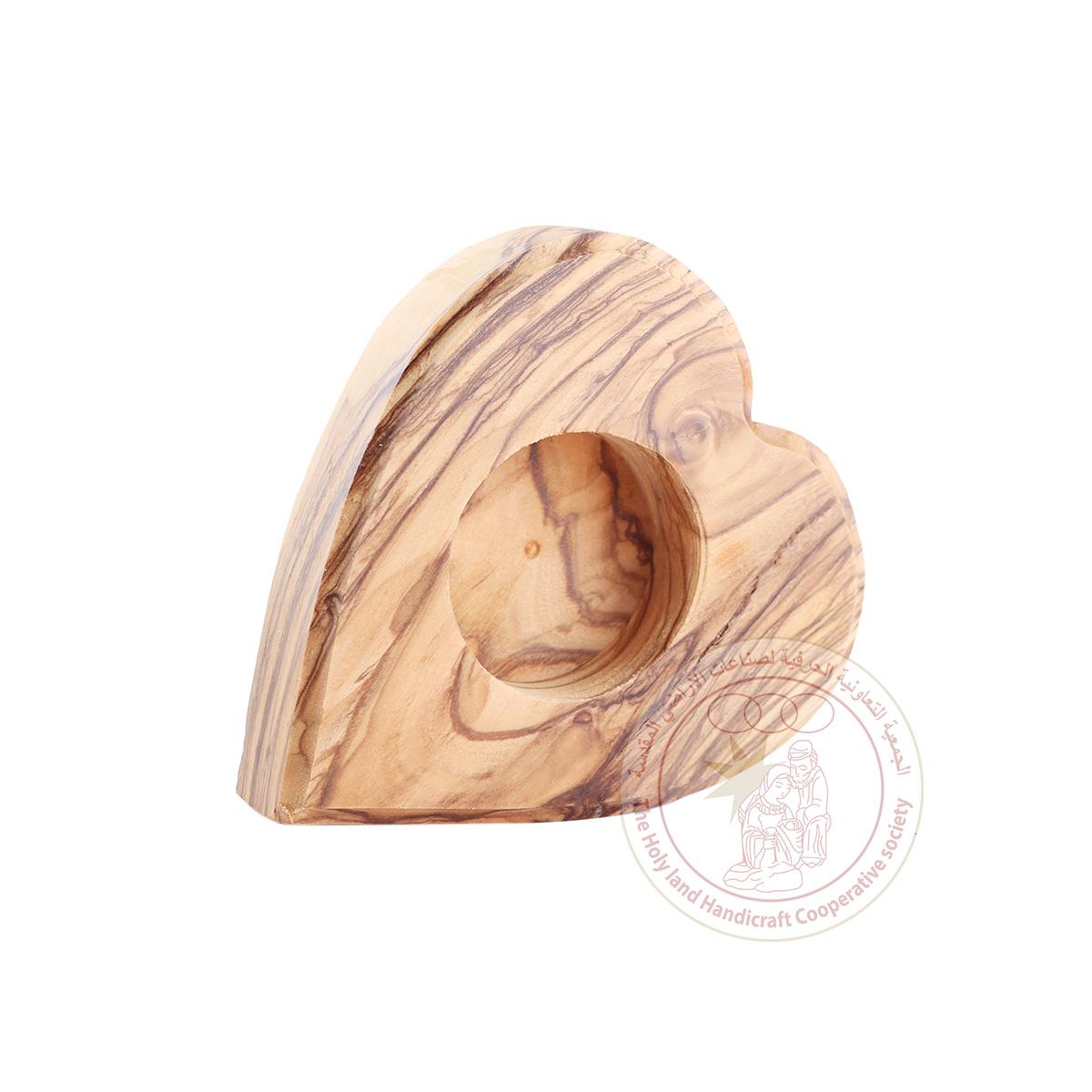 This tea light candle holder is carved in the shape of a heart, and is made of olive wood. It was made by artisans from Bethlehem.