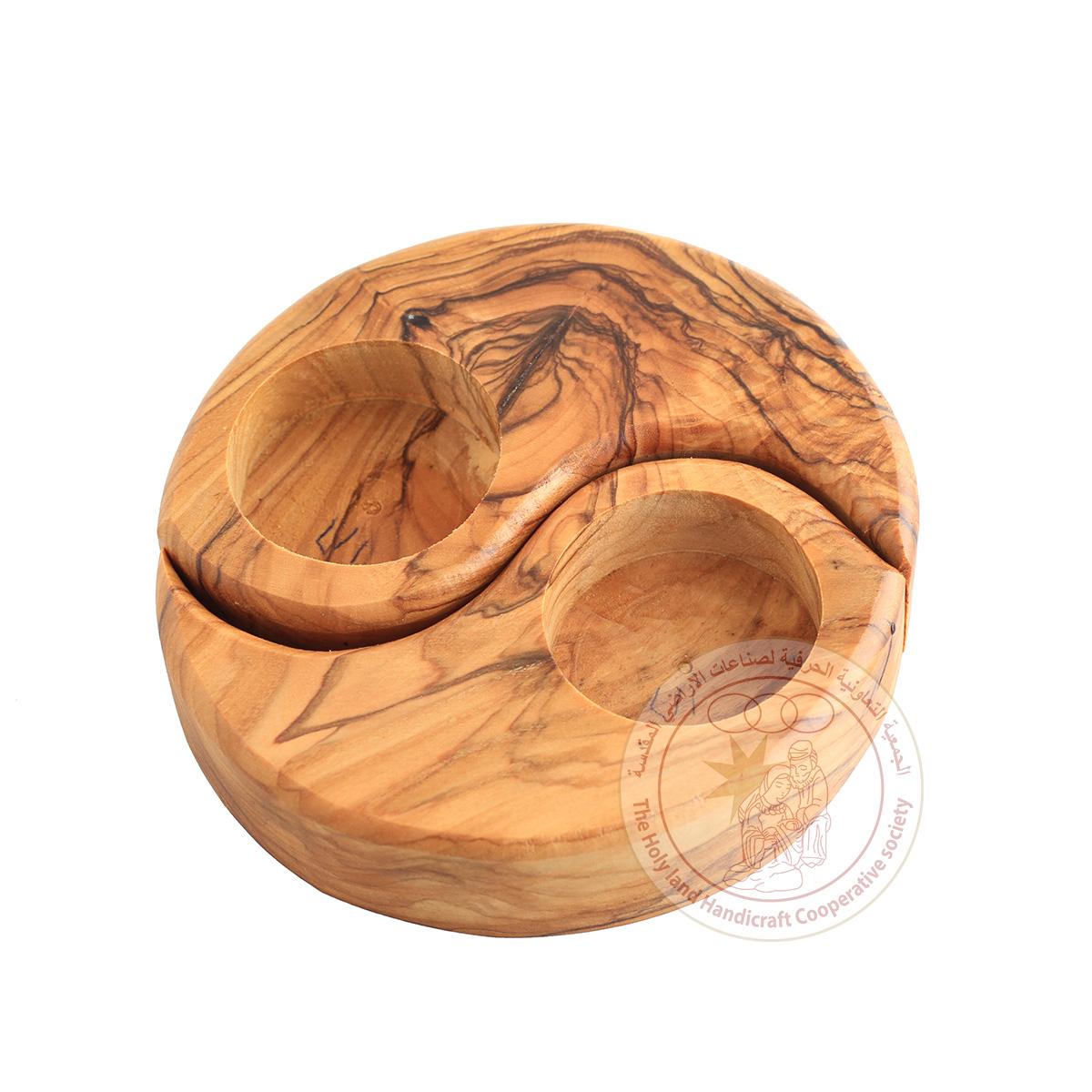 This tea light candle holder is carved in the shape of a ying-yang, and is made of olive wood. It was made by artisans from Bethlehem.