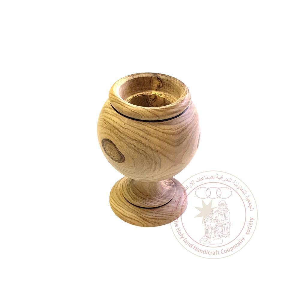 This round candle holder with a base is made of olive wood by Bethlehem artisans.