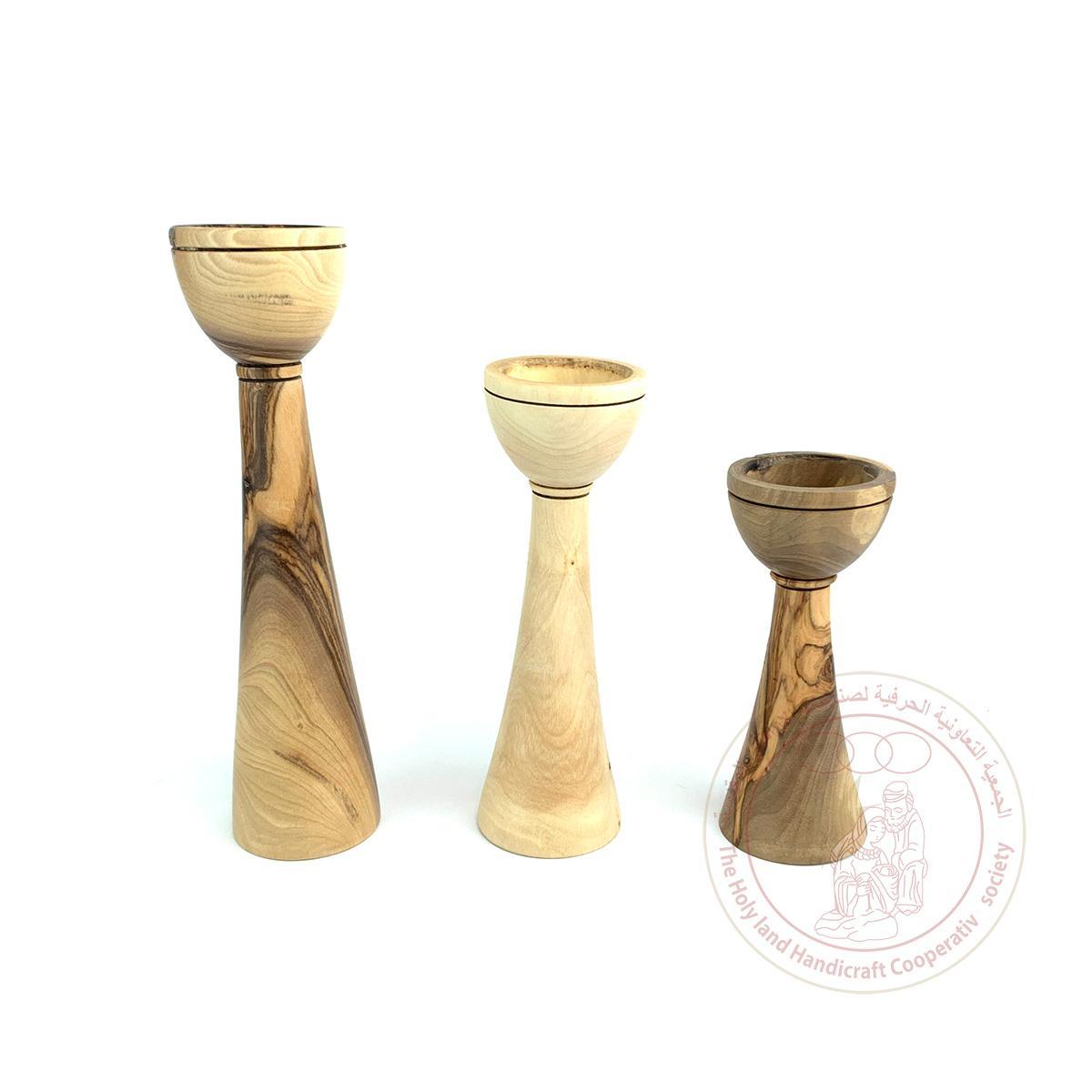 This three-piece candle holder set is made of olive wood by Bethlehem artisans.