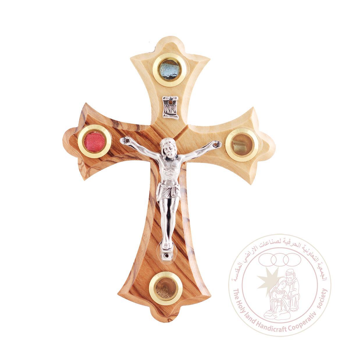 This is an Orthodox cross with four inlaid pieces of earth, leaves and incense from the Holy Land, suitable for hanging on a wall. The cross is made of olive wood by artisans from Bethlehem.