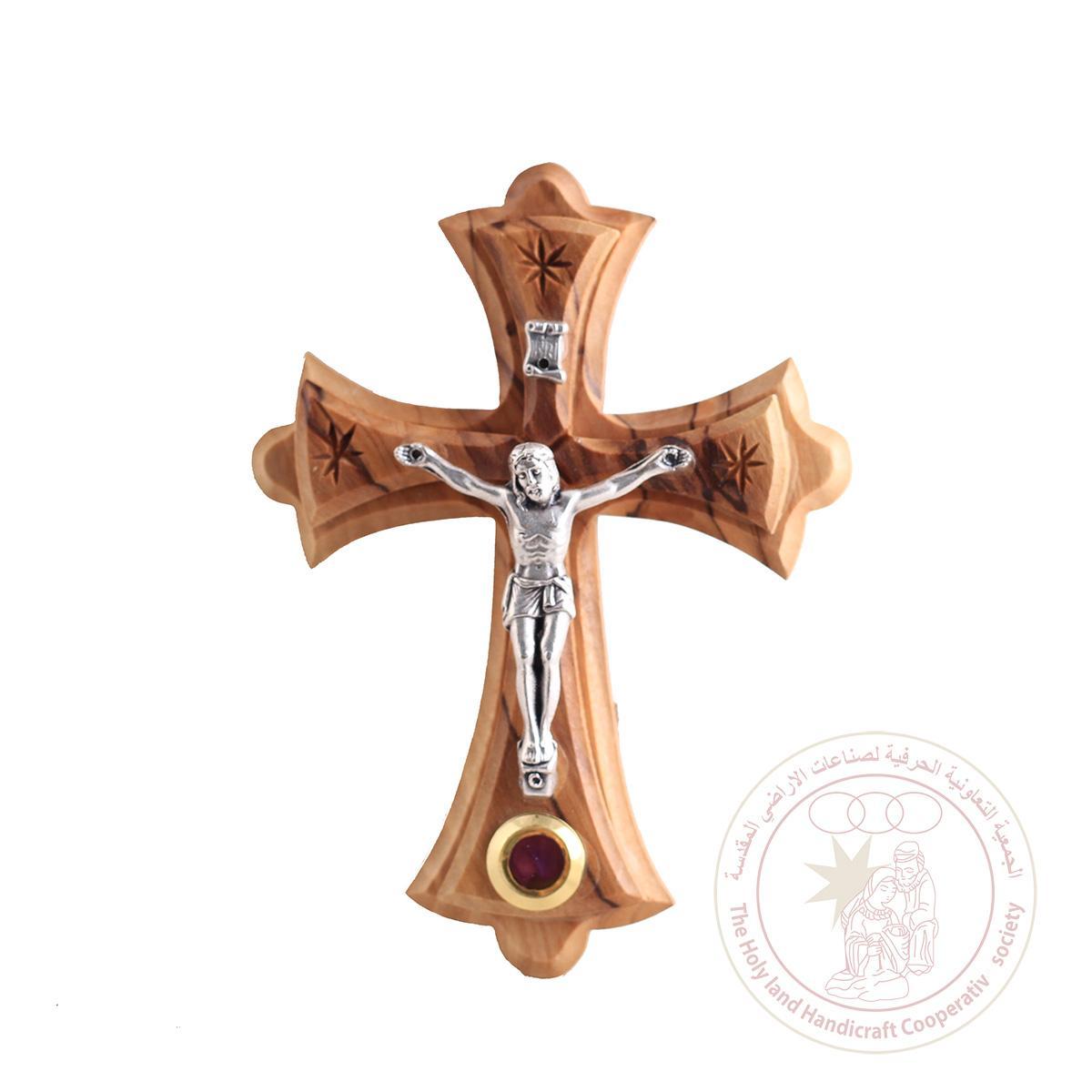 This is an Orthodox cross with an inlaid piece of leaves from the Holy Land. The cross is made of olive wood by artisans from Bethlehem.