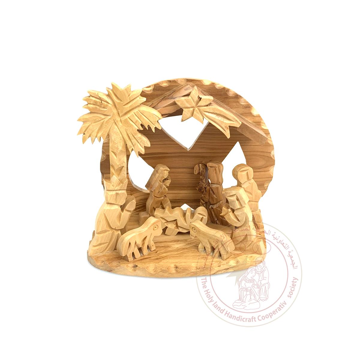 This Nativity scene includes the Holy Family, Magi, Shepherds, Animals, a Palm Tree, and an abstract manger with rounded backdrop. It was made from olive wood by Bethlehem artisans.