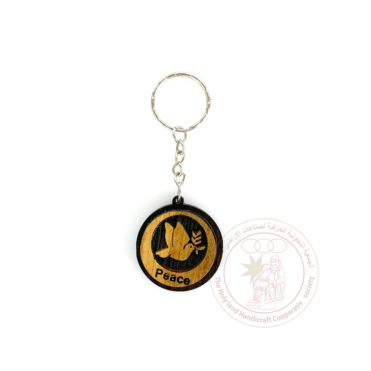 This is a keychain made of olive wood, depicting the Dove of Peace. Made by Bethlehem artisans.
