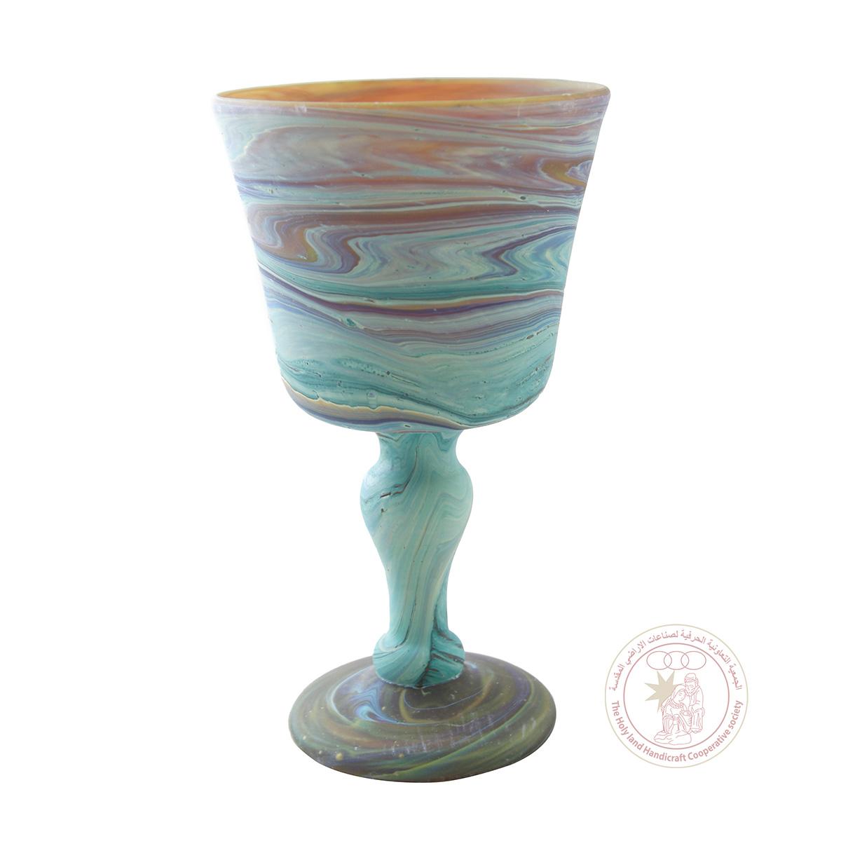 This 10 CM wine glass is made of swirled-style Phoenician glass and is designed in conical style with a long neck and a wrap. It was made by artisans from Hebron.